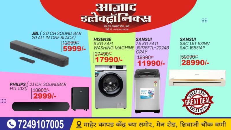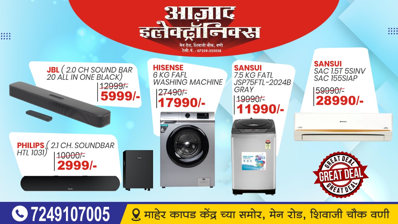 बहुगुणी डेस्क, वणी: शहरातील आझाद इलेट्रॉनिक्स (माहेर कापड केंद्र समोर, मार्केट रोड) तर्फे दिनांक 24 फेब्रुवारी रोजी एक दिवशीय ग्रेट डिल ऑफर लॉन्च करण्यात आली हे. यात जेबीएलचा साउंडबार अवघ्या 5,990 रुपये तर फिलिप्सचा साउंडबार अवघ्या 2,990 रुपयांमध्ये उपलब्ध होणार आहे. इतक्या कमी किंमतीत शहरात पहिल्यांदाच साउंडबार उपलब्ध होत आहे. याशिवाय सॅनसुईची वॉशिंग टॉप लोड वॉशिंगमशिन 11,990 रुपये व हाईसेन्सची फ्रंट लोड वॉशिंग मशिन अवघ्या 17,990 रुपयांमध्ये उपलब्ध होत आहे. दिवाळी नंतर पहिल्यांदाच शहरात अशी ग्रेट डिल ऑफर उपलब्ध होत आहे.