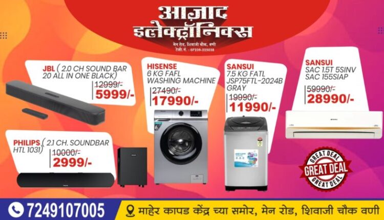 आझाद इलेक्ट्रॉनिक्स हे सर्व प्रकारच्या होम अप्लायन्सेच्या विक्रीसाठी परिसरात प्रसिद्ध आहे. सोनी, सॅमसंग, आयएफबी, व्हर्लपूल, बॉश, वन प्लस, फिलिप्स, वोल्टास, पॅनासॉनिक इत्यादी बँडेड वस्तू इथे उपलब्ध आहेत. ऑफरचा लाभ घेण्यासाठी व वस्तूंच्या डेमोसाठी मार्केट रोडवरील शिवाजी चौक, माहेर कापड केंद्रासमोरील आझाद इलेक्ट्रॉनिक्स व शाम टॉकिज जवळील प्रतिष्ठानात भेट द्यावी असे आवाहन आझाद इलेक्ट्रॉनिक्सचे संचालक राजकुमार अमरवानी व दिलीप अमरवानी यांच्यातर्फे करण्यात आले आहे.