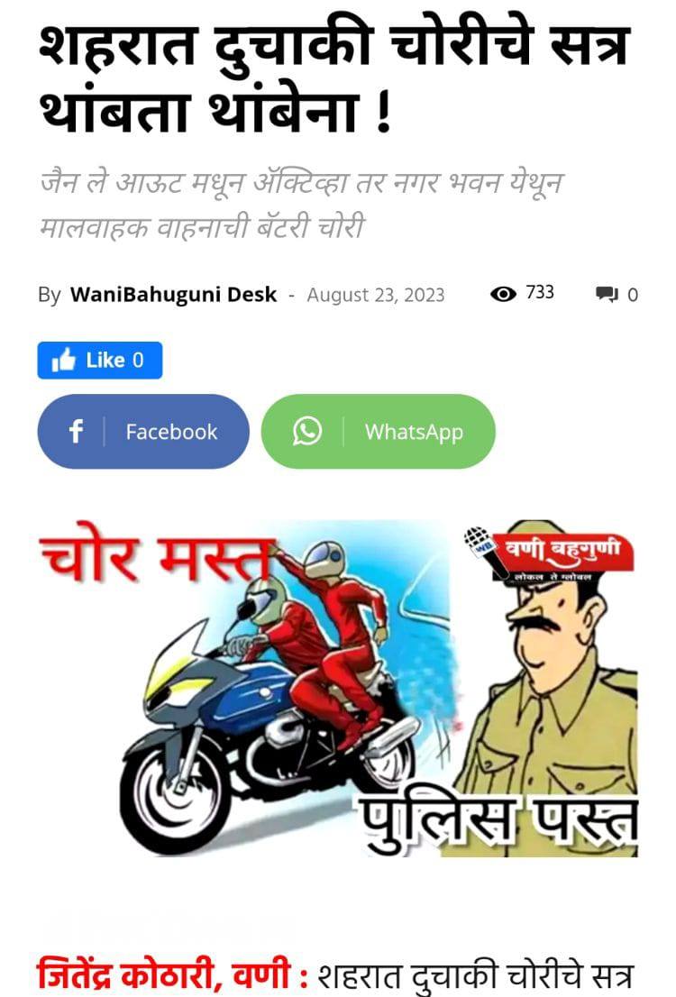 त्यांनी काही ठिकाणी शोध घेतला. मात्र मोपेडचा शोध न लागल्याने अखेर त्यांनी वणी पोलीस स्टेशन गाठत याबाबत तक्रार दिली. पोलिसांनी त्यांची ॲक्टिवा (किंमत 30 हजार) अज्ञात चोरट्यांनी चोरुन नेल्याची तक्रार नोंदवली. ‘वणीतील दुचाकी चोरीचे सत्र थांबता थांबेना !’ या हेडिंगखाली वणी बहुगुणीने बुधवारी दिनांक 23 ऑगस्ट रोजी संध्याकाळच्या सुमारास वृत्त प्रकाशित केले होते.