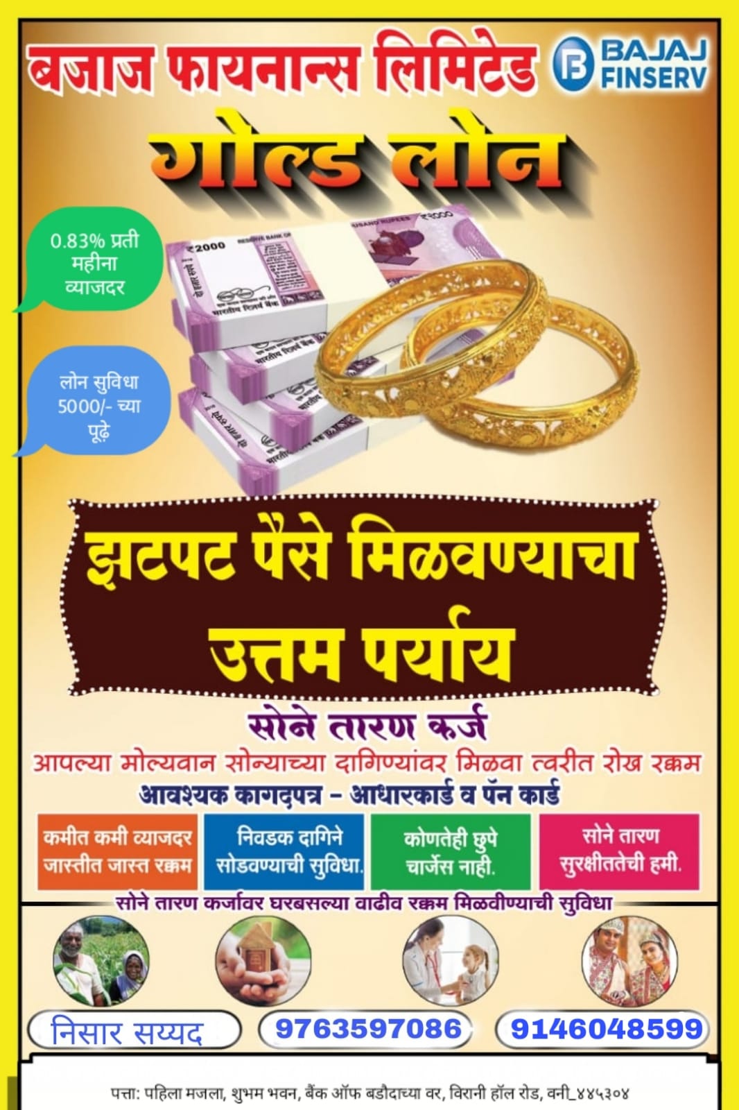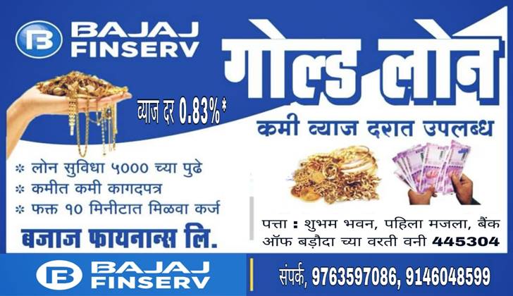 बहुगुणी डेस्क, वणी: बजाज फायनान्स (बजाज फिनसर्व) लिमिटेडतर्फे नवरात्री निमित्त आतापर्यंतच्या सर्वात कमी व्याज दरात गोल्ड लोन (सोने तारण कर्ज) उपलब्ध करून देण्यात आले आहे. यात 0.83 टक्के प्रति महिना व्याजदर असून 5 हजारापासून 2 करोड़पर्यंत सोने तारण ठेऊन ग्राहकांना कर्ज उपलब्ध करून देण्यात येत आहे. विशेष म्हणजे आधारकार्ड व पॅनकार्डवर हे दोन डॉक्युमेन्ट देऊन अवघ्या 10 मिनिटात कर्ज सेवा मिळणार आहे. अधिक माहितीसाठी 9763597086 व 9146048599 या क्रमांकावर किंवा शुभव भवन, विराणी हॉल रोड येथे संपर्क साधण्याचे आवाहन करण्यात आले आहे.