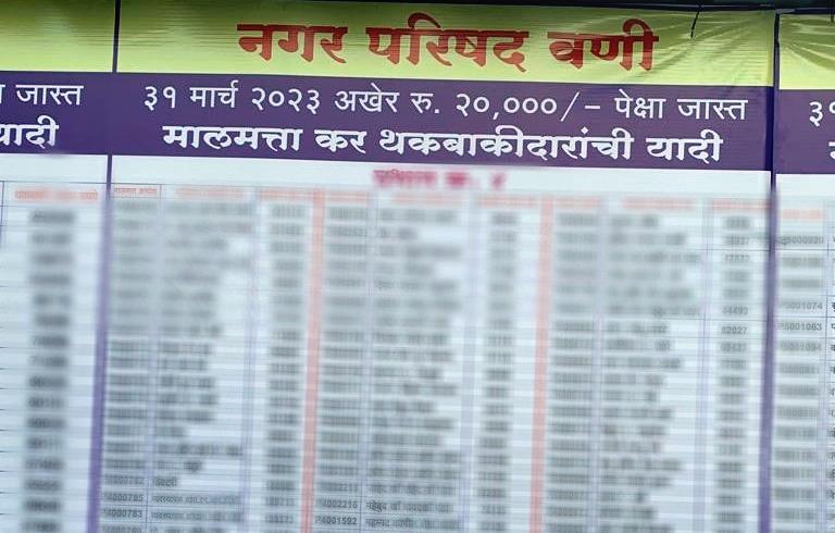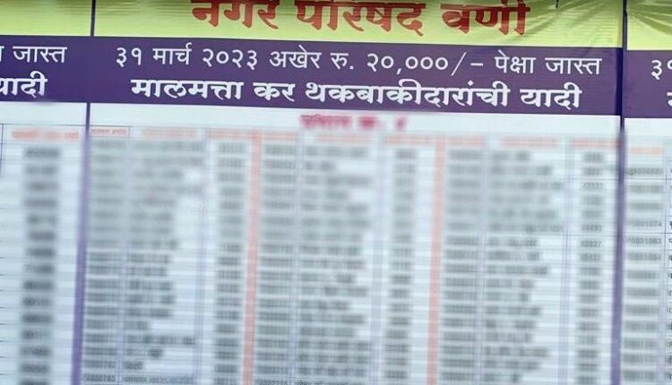 वणी नगर परिषदेने 31 मार्च 2023 पर्यंत 20 हजार रुपयांपेक्षा जास्त मालमत्ता कर थकबाकीदारांची यादी प्रसिद्ध केली आहे. शहरातील प्रभाग क्रमांक 1 ते 8 मधील थकबाकीदाराच्या मालमत्ता क्रमांक, थकबाकीदाराचा नाव व थकीत मालमत्ता रक्कमसह फ्लेक्स बोर्ड नगर परिषद कार्यालयात दर्शनी भागात लावण्यात आले आहे. यात सर्वात जास्त 1 कोटी 95 लाख रुपये प्रभाग क्रमांक 4 मधील मालमत्ता धारकांकडे थकीत आहे. तर सर्वात कमी 19 लाख 25 हजार प्रभाग क्रमांक 7 मधील मालमत्ता धारकांकडून येणे बाकी आहे.