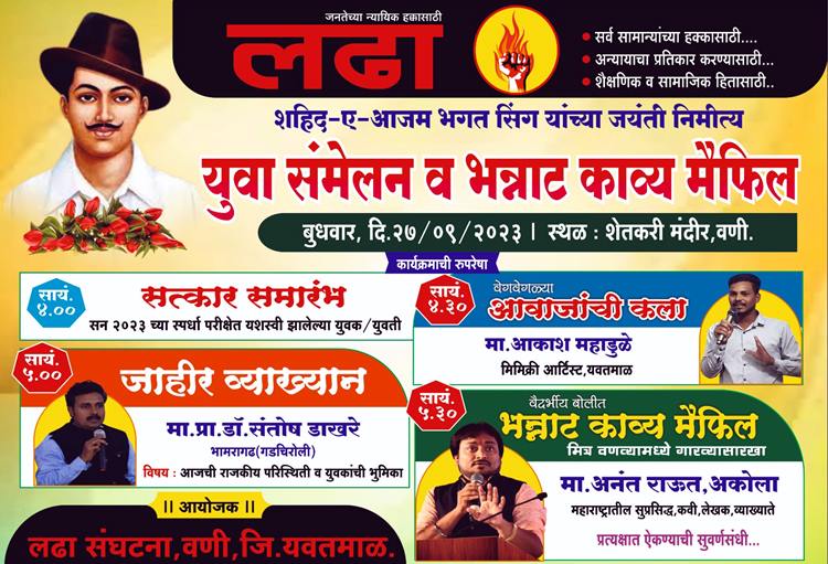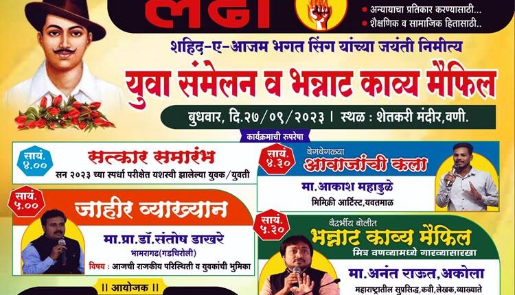 जितेंद्र कोठारी, वणी: भगतसिंग यांच्या जयंतीनिमित्त वणीत बुधवारी दिनांक 27 सप्टेंबर रोजी युवा संमेलनाचे आयोजन करण्यात आले आहे. शेतकरी मंदिर येथे दुपारी 3.30 ते रात्री 10 पर्यंत हे युवा संमेलन चालणार आहे. या संमेलनात काव्य संमेलन, मिमिक्री, व्याख्यान अशा विविध कार्यक्रमाचे आयोजन करण्यात आले आहे. सुप्रसिद्ध स्तंभलेखक व अभ्यासक प्रा. डॉ. संतोष डाखरे यांची या कार्यक्रमाला मुख्य मार्गदर्शक म्हणून उपस्थिती राहणार आहे. लढा संघटनेतर्फे या युवा संमेलनाचे आयोजन करण्यात आले आहे.