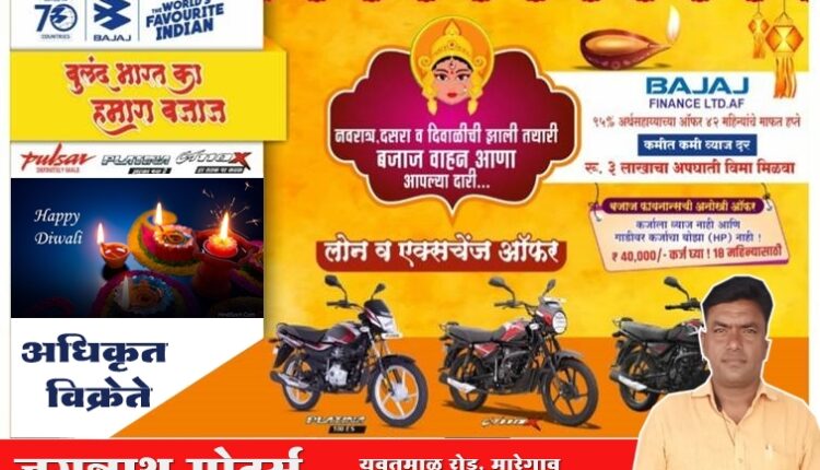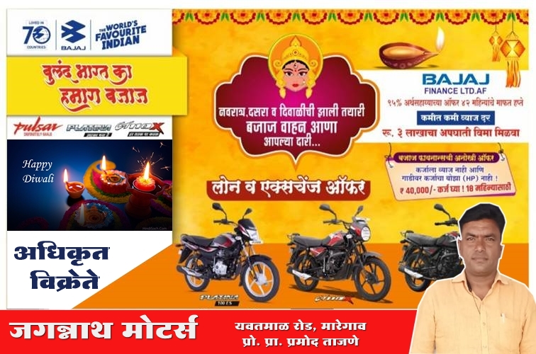 ऍडव्हटोरिअलवणीवार्ता जगन्नाथ मोटर्सतर्फे (बजाजचे अधिकृत शोरूम) मारेगाव तालुक्यातील सर्वांना दिवाळीच्या हार्दिक शुभेच्छा प्रो. प्रा. प्रमोद ताजणे.... लोन व एक्सचेंज सुविधा उपलब्ध एकदा शोरुमला अवश्य भेट द्या. By WaniBahuguni Desk On Oct 26, 2022 12 Share Jagannath MotorsLead Story 12 Share WhatsAppFacebookTwitter