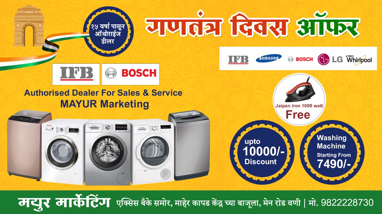आधी मयूर रेडियोज नावाने असणारे मयूर मार्केटिंक हे प्रतिष्ठाण परिसरात एक सुपरिचित नाव आहे. 1980 पासून हे प्रतिष्ठाण इलेक्ट्रॉनिक्स वस्तूंच्या विक्रीच्या व्यवसायात असून आपली सेवा आणि विश्वास यासाठी ओळखले जाते. गणतंत्र दिनानिमित्त ग्राहकांसाठी मयूर मार्केटिंगमध्ये (सोनी शोरुम) फेस्टिव्हल ऑफर लॉन्च केली आहे. या ऑफरचा अधिकाधिक लाभ घ्यावा तसेच अधिक माहितीसाठी मयूर मार्केटिंग (सोनी शोरूम) माहेर कापड केंद्राच्या बाजूला, मार्केट रोड वणी येथे भेट द्यावी असे आवाहन करण्यात आले आहे.