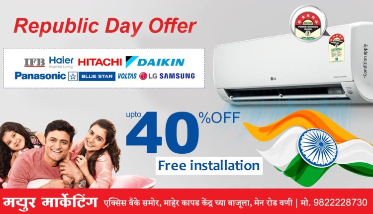विवेक पिदूरकर: शहरातील इलेक्ट्रॉनिक्स वस्तूंच्या विक्रीसाठी प्रसिद्ध असलेल्या मयूर मार्केटिंग (सोनी शोरुम) येथे 26 जानेवारी निमित्त ग्राहकांसाठी खास ‘रिपब्लिक डे’  ऑफर लॉन्च करण्यात आली आहे. या ऑफरला ग्राहकांचा उत्स्फुर्त प्रतिसाद मिळत आहे. या ऑफरचे प्रमुख आकर्षण एसी ठरत आहे. या ऑफरमध्ये ग्राहकांना ब्रँडेड एसीवर 40 टक्यापर्यंतची घसघशीत सुट दिली जात आहे. याशिवाय इतर इलेक्ट्रॉनिक्स वस्तूंवरही 30 टक्यांपर्यंत सुट आहे. तसेच अनेक वस्तूंवर एक गिफ्टही उपलब्ध आहे. ही ऑफर केवळ रविवार पर्यंत असल्याने ग्राहकांनी त्वरित याचा फायदा घेऊन मोठी बचत करावी असे आवाहन मयूर मार्केटिंग तर्फे करण्यात आले आहे.