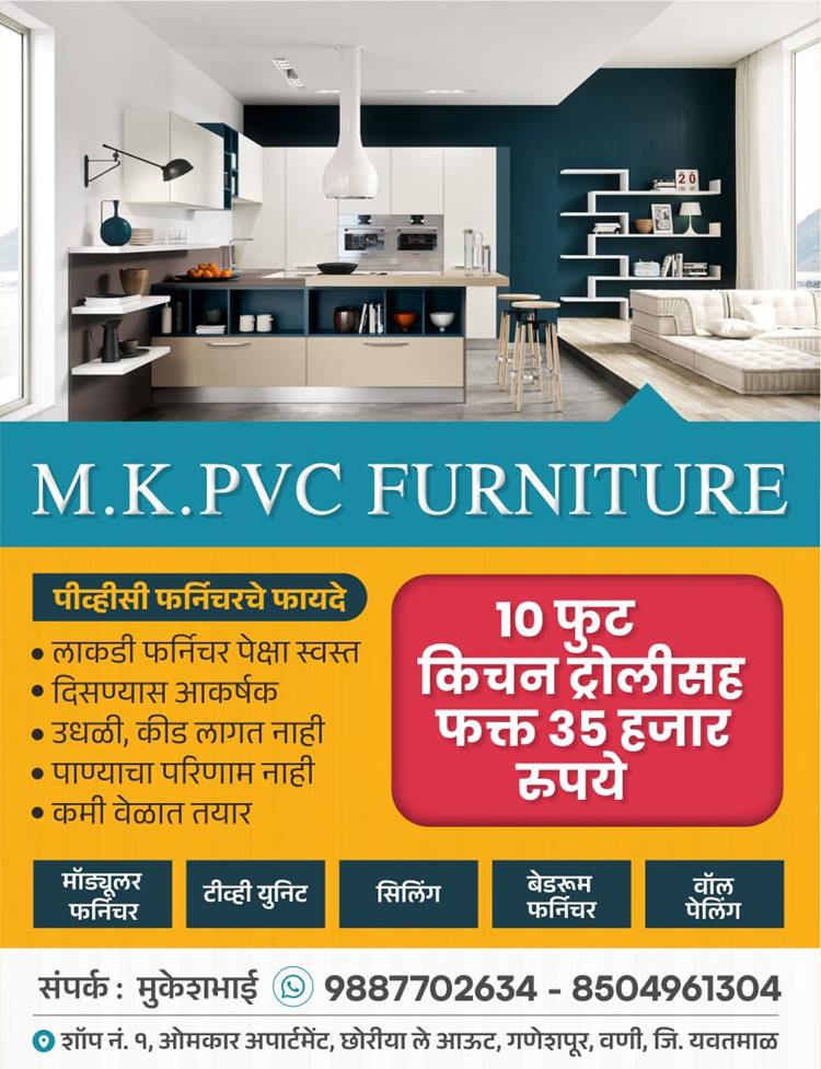 बहुगुणी डेस्क, वणी: वणी व परिसरात पीव्हीसी फर्निचरसाठी प्रसिद्ध असलेल्या एम के पीव्हीसी फर्निचर येथे स्वातंत्र्य दिन व पोळ्यानिमित्त विशेष ऑफर सुरु करण्यात आली आहे. त्यात ग्राहकांना अवघ्या 35 हजारात 10 फूट किचन विद ट्रॉली तयार करता येणार आहे. सोबत यावर क्रॉकरी बॉक्स मोफत मिळणार आहे. ही ऑफर केवळ पोळ्या पर्यंत सुरु असल्याने ग्राहकांनी छोरिया ले आऊट येथील शॉप नंबर 1 येथील M.K. पीव्हीसी फर्निचर येथे आपल्याला पीव्हीसी फर्निचरचा डेमो पाहता येईल. तसेच आवडल्यास आपल्याला मॉड्युलर किचन, टीव्ही युनिट, बेडरूम फर्निचर, वॉल पॅलिंग इत्यादी फर्निचर देखील बनवता येईल. त्यामुळे एकदा एम के पीव्हीसी फर्निचरला अवश्य भेट द्यावी, किंवा 9887702634 (मुकेशभाई) या क्रमांकावर संपर्क साधावा असे आवाहन संचालकांतर्फे करण्यात आले आहे.