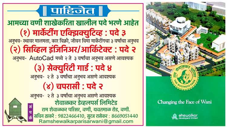 बहुगुणी डेस्क, वणी: विदर्भातील सुप्रसिद्ध व हजारों ग्राहकांच्या विश्वासास पात्र असलेल्या शेवाळकर डेव्हलपर्स लिमिटेड या कंपनीच्या वणी शाखेसाठी विविध कर्मचा-यांची आवश्यकता आहे. वणी शाखेत सध्या चार पदांसाठी एकूण 11 जागा असून यात मार्केटिंग एक्झेक्युटिव्ह साठी 3 पदे, सिव्हिल इंजिनिअर/ आर्किटेक्ट साठी 2 पदे, 4 सेक्युरिटी गार्ड व 4 चतुर्थ श्रेणी कर्मचारी तात्काळ भरणे आहे.
