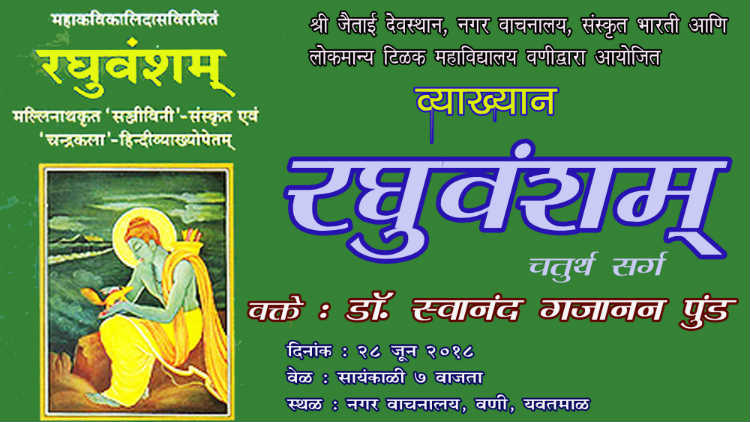 गत तीन महिन्यांपासून महाकवी कालिदास विरचित रघुवंशम् चा रसास्वाद या व्याख्यानमालेत घडत आहे. यातील विविध प्रसंगांचा परिचय प्रा. डॉ. स्वानंद गजानन पुंड करून देतील.