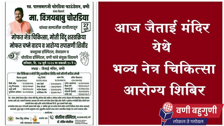 वणी बहुगुणी डेस्क: समाजकारणी, राजकारणी आणि दातृत्त्वाचे धनी असलेल्या विजय चोरडिया यांच्या पुढाकारातून आज शनिवारी वणी येथील जैताई मंदिराच्या प्रांगणात भव्य मोफत आरोग्य शिबिर, नेत्र चिकित्सा व मोती बिंदू शस्त्रक्रिया शिबिर व चष्मे वाटपाचे आयोजन करण्यात आले आहे. सकाळी 10 ते दु. 4 या वेळेत हे शिबिर होणार आहे. सदर शिबिरात कस्तुरबा हॉस्पिटल, सेवाग्रामची टीम आरोग्य सेवा देणार आहे. सदर शिबिराचे आयोजन विश्व हिंदू परिषद, बजरंग दल, व स्व. पारसमलजी चोरडिया फाउंडेशन वणी व चोरडिया हॉस्पिटल यांच्या सहकार्यातून करण्यात आले आहे. दिनांक 1 ऑगस्ट रोजी पाटण येथे याच शिबिराचे आयोजन करण्यात आले आहे.