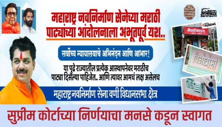 जितेंद्र कोठारी, वणी : राज्यातील सर्व आस्थापना, दुकाने तसेच कार्यक्षेत्रात येत्या दोन महिन्यात मराठी भाषेमध्ये पाट्या (Signboard) लावा. असा आदेश सोमवारी सर्वोच्च न्यायालयाने राज्यातील व्यापाऱ्यांना दिला. सर्वोच्च न्यायालयाच्या या निर्णयामुळे महाराष्ट्र नवनिर्माण सेनेने ‘मराठी पाट्या’ ह्या मुद्द्यासाठी गेली कित्येक वर्षं जो संघर्ष केला, त्याला यश मिळाल्याचे मनसे प्रमुख राज ठाकरे यांनी सांगितले. सुप्रीम कोर्टाच्या आदेशानंतर वणी येथे मनसे कार्यकर्त्यांनी फटाके फोडून जल्लोष साजरा केला.
