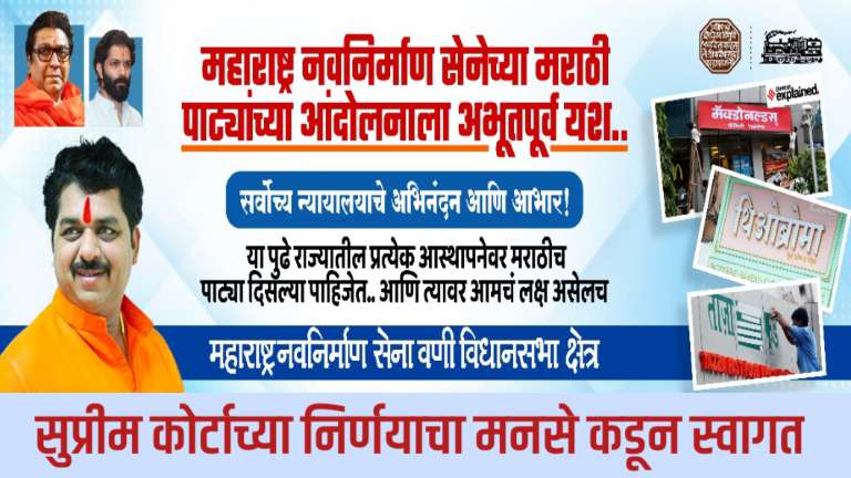मराठी भाषा ही आमची मातृभाषा आहे. मराठीचा आम्हाला अभिमान आहे. महाराष्ट्रातील दुकानांवरील पाट्या मराठी भाषेत असायला पाहिजे, यासाठी मनसे प्रमुख राजसाहेब ठाकरे मागील 17 वर्षापासून लढा देत होते. मराठी पाटी आंदोलनामुळे माझ्यासह अनेक महाराष्ट्र सैनिकांना जेल मध्ये सुद्धा जावे लागले होते. कोर्टाने अखेर हा मुद्दा निकालात काढल. सर्व व्यापाऱ्यांना दोन महिन्यात मराठी पाट्या लावण्याचे आदेश देण्यात आले आहेत. याबद्दल सुप्रीम कोर्टाचे आभार व्यक्त करतो. मराठी भाषेत पाट्या न लावणाऱ्या व्यापाऱ्याविरुद्ध शासन कारवाई करेल ते करेल, परंतु या बाबीकडे मनसैनिकांचेही लक्ष राहणार आहे.