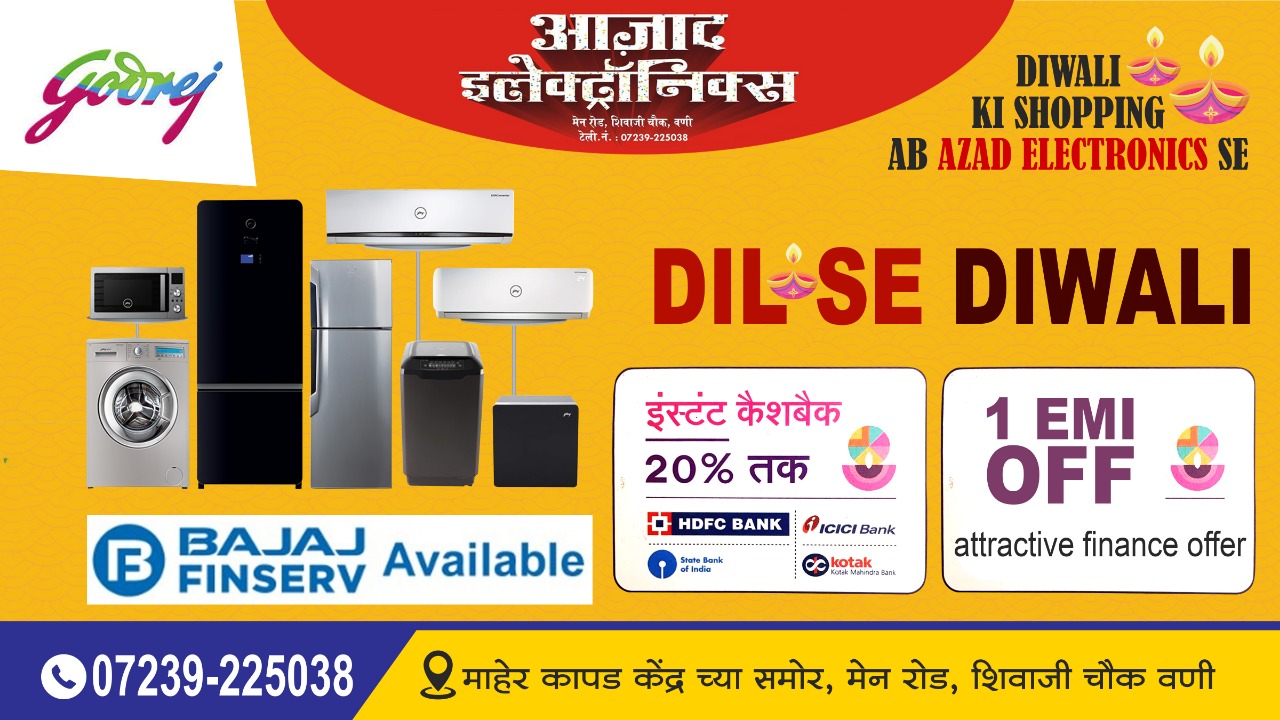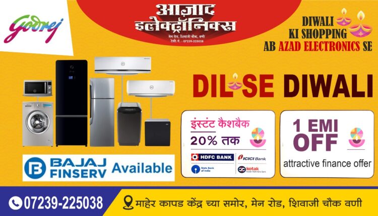 आझाद इलेक्ट्रॉनिक्स हे सर्व प्रकारच्या होम अप्लायन्सेच्या विक्रीसाठी परिसरात प्रसिद्ध आहे. सोनी, सॅमसंग, आयएफबी, व्हर्लपूल, बॉश, वन प्लस, फिलिप्स, वोल्टास, पॅनासॉनिक इत्यादी बँडेड वस्तू इथे उपलब्ध आहेत. ‘दसरा धमाका’ ऑफरचा लाभ घेण्यासाठी व वस्तूंच्या डेमोसाठी मार्केट रोडवरील शिवाजी चौक, माहेर कापड केंद्रासमोरील आझाद इलेक्ट्रॉनिक्स व शाम टॉकिज जवळील प्रतिष्ठानात भेट द्यावी असे आवाहन आझाद इलेक्ट्रॉनिक्सचे संचालक राजकुमार अमरवानी व दिलीप अमरवानी यांच्यातर्फे करण्यात आले आहे.