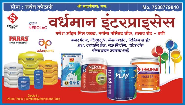 बहुगुणी डेस्क, वणी: दिवाळी आली की, अनेक घरात रंगकाम केले जाते. पण घराला बाहेरून, आतून, बेडरूमला कोणता रंग द्यायचा हा सर्वात मोठा प्रश्न असतो. पेन्टमुळे घराच्या सौंदर्याला बहार येते. मार्केटमध्ये वेगवेगळ्या कंपन्याचे पेंट उपलब्ध आहे. मात्र वाजवी दरात कुठे मिळणार? असा प्रश्न नेहमीच सर्वांना पडतो. मात्र यावरचे एकमेव उत्तर म्हणझे वणी शहरात तलाव रोडवरील वर्धमान इंटरप्रायजेस. यात तुम्हा सर्व प्रकारचे पेन्ट्स माफक दरात मिळतात. शिवाय दिवाळी निमित्त काही खास ऑफर देखील ग्राहकांना मिळणार आहे. येथे एशियन पेंट, नेरोलक पेंट, शालीमार पेंटसह बिल्डींग व्हाईट, बिर्ला व्हाईट, वॉलपुट्टी, पीओपी बैग, टरपाईन ऑईल, ब्रश, रोलर ब्रश उपलब्ध आहे. कम्प्युटराईज्ड कलर मिक्सर मशीन द्वारे तुमच्या आवडीनुसार विविध शेड्स तयार करून मिळेल. तर चला दिवाळीपूर्वी आवडीचे रंग निवडून आपल्या घराला नवा लूक देऊ.