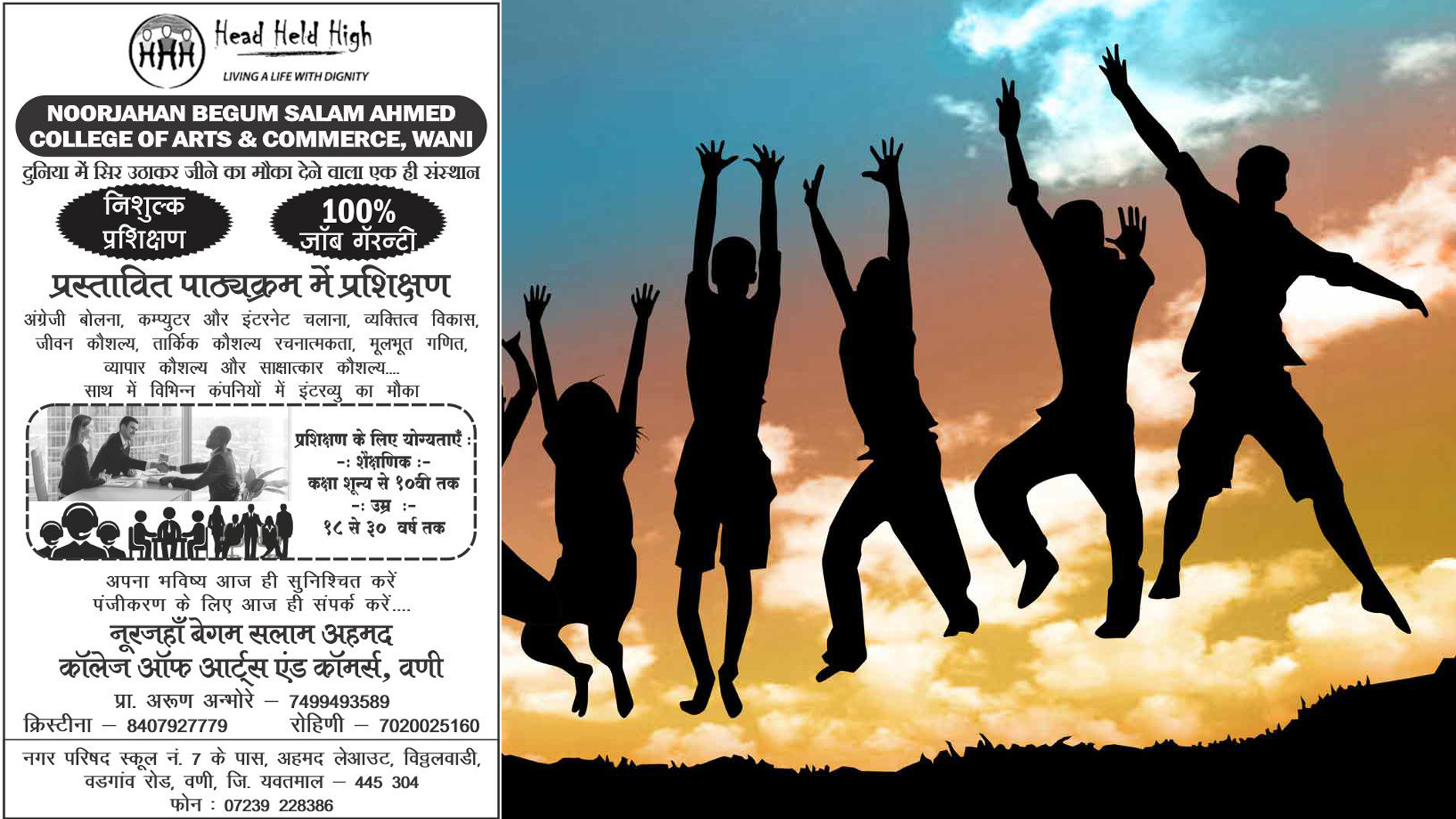 इंग्रजी संभाषण, कंप्युटर अॅण्ड इंटरनेट, पर्सनालिटी डेव्हलपमेंट, जीवन कौशल्य, इंटरव्ह्यू कौशल्य या विषयांवर तज्ज्ञांचं मार्गदर्षन होईल. शिक्षण शून्य ते दहावी असल्यास 18 ते 30 वयोगटातील कुणालाही यात प्रवेश घेता येईल. नगर परिषद शाळा क्रमांक 7, अहमद लेआऊट, वडगाव रोड, विठ्ठलवाडी येथे नूरजहॉं बेगम सलाम अहमद कॉलेज ऑफ आर्टस् अॅण्ड कॉमर्स येथे प्रवेश प्रक्रिया सुरू झालेली आहे. अधिक माहितीकरिता प्राचार्य अरूण अंभोरे 7499493589, क्रिस्टिना 8407927779, रोहिणी 7020025160 यांच्याशी संपर्क साधावा अशी विनंती एका प्रसिद्धीपत्रकाद्वारे करण्यात आली आहे.