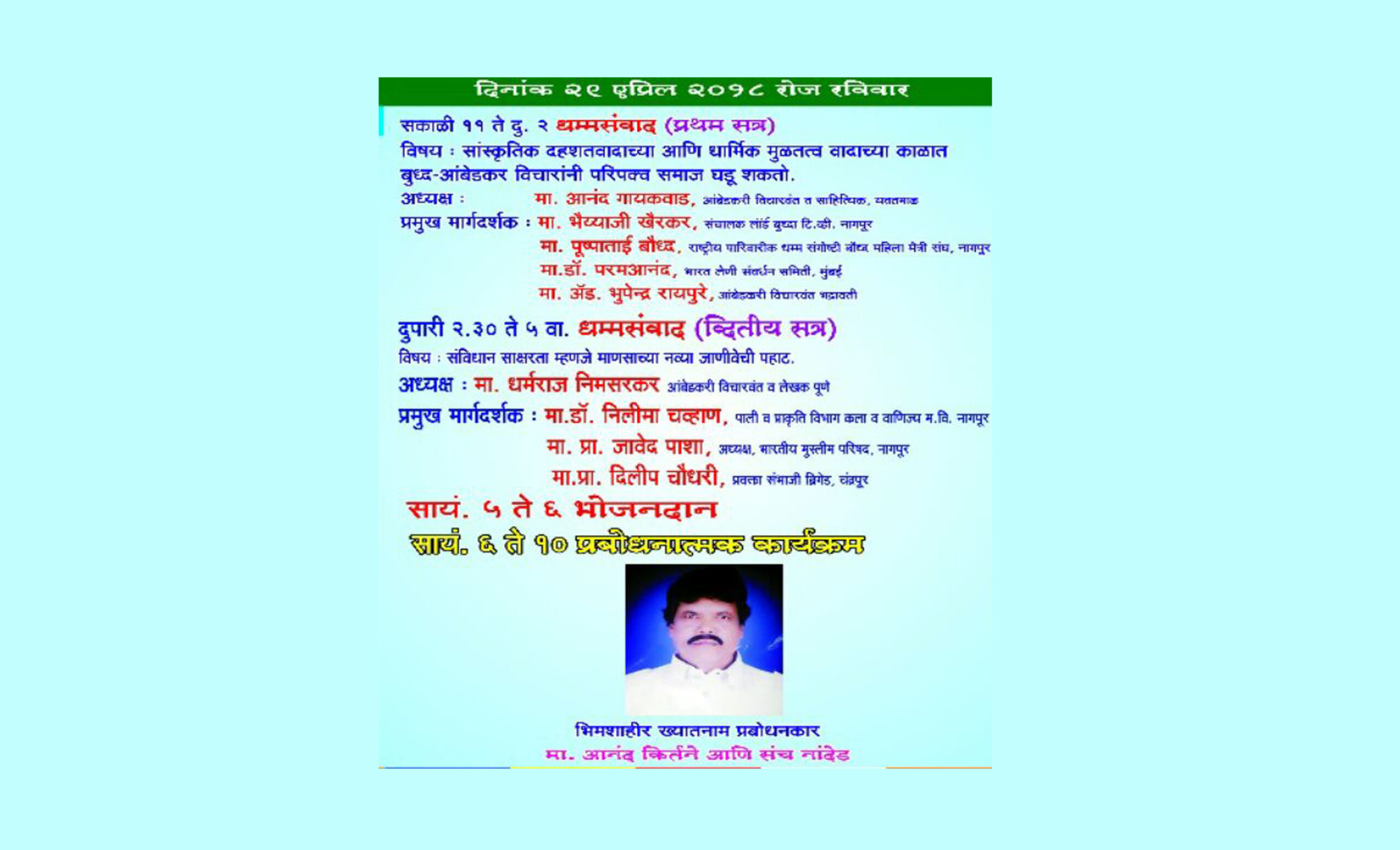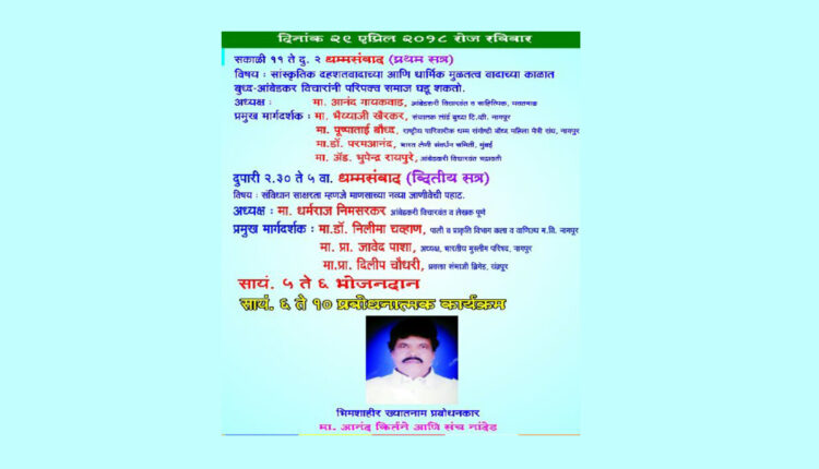 सायंकाळी 6 ते 10 वेळात प्रबोधनात्मक कार्यक्रम होतील. यात नांदेड येथील ख्यातनाम भीमशाहीर तथा प्रबोधनकार व आनंद कीर्तने आणि संच कार्यक्रम सादर करतील. रविवारी आणि सोमवारी होणाऱ्या कार्यक्रमांना उपस्थित राहण्याची विनंती आयोजकांनी केली आहे.