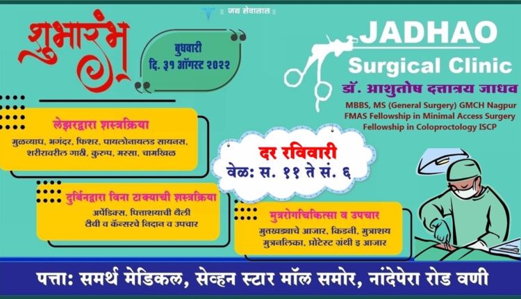 बहुगुणी डेस्क, वणी: नागपूर येथील सुप्रसिद्ध सर्जन व मुळचे वणीचे असलेले डॉ. आशुतोष दत्तात्रय जाधव (MBBS, MS) यांच्या जाधव सर्जिकल क्लिनिकचे बुधवारी गणेश चतुर्थीच्या दिवशी उद्घाटन होणार आहे. नांदेपेरा रोडवरील सेव्हन स्टार मॉल समोर समर्थ मेडिकल येथे डॉ. जाधव यांचे सर्जिकल क्लिनिक सुरू होणार आहे. दर रविवारी सकाळी 11 ते संध्याकाळी 6 या वेळेत वणी, मारेगाव, झरी, वरोरा इत्यादी तालुक्यातील रुग्णांना उपचार घेता येणार आहे.