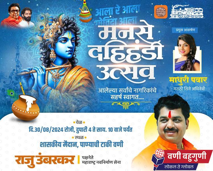 भव्य दिव्य दहिहंडीचे मनसेतर्फे आयोजन करण्याचे हे दुसरे वर्ष आहे. गेल्या वर्षी प्राजक्ता माळी यांनी या दहिहंडी उत्सवाला प्रमुख पाहुणे म्हणून हजेरी लावली होती. यावर्षी विविध मराठी मालिका व सिनेमात अभिनय केलेल्या माधुरी पवार यांची या उत्सवाला प्रमुख अतिथी म्हणून उपस्थिती राहणार आहे. सर्व वणीकर नागरिकांनी दहीहंडीचा आनंद लुटण्यासाठी येण्याचे आवाहन उंबरकर यांनी केले आहे.