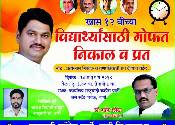 विवेक तोटेवार, वणी: दिनांक 30 मे बुधवारी 12 वीचा निकाल लागणार आहे. त्यानिमित्त राष्ट्रवादी काँग्रेसतर्फे वणी आणि परिसरातील विद्यार्थ्यांसाठी मोफत निकाल आणि मार्कसिटची सुविधा दिली जाणार आहे. दुपारी 1 ते रात्री 8 पर्यंत याा सुविधेचा लाभ विद्यार्थ्यांना घेता येणार आहे. वणी बसस्थानक समोरील राष्ट्रवादी काँग्रेसच्या कार्यालयात विद्यार्थ्यांना त्यांचा निकाल पाहता येणार असून निकाल बघितल्यानंतर लगेच त्यांना मार्कसिटची प्रिंट काढून दिली जाणार आहे.