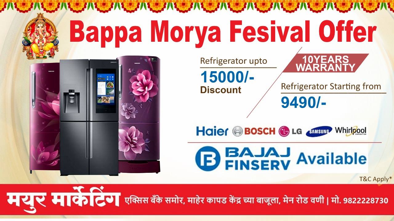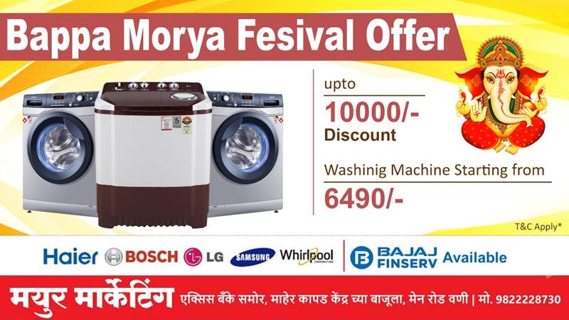 मयूर मार्केटिंग इथे बाप्पा मोरया ऑफर अंतर्गत प्रत्येक वस्तूंवर एक आकर्षक गिफ्ट दिले जाणार आहे.* यात होम थिएटर, ब्लुटूथ स्पिकर, हेड फोन व सोनी कंपनीचा 10 हजार MAH चा पॉव्हर बँक ग्राहकांना मोफत दिला जाणार आहे. मयूर मार्केटिंग गेल्या 16 वर्षांपासून आय.एफ.बी. बॉशचे अधिकृत डीलर आहेत. वस्तू खरेदीचं एक विश्वसनीय ठिकाण म्हणून मयूर मार्केटिंगची ओळख आहे.
