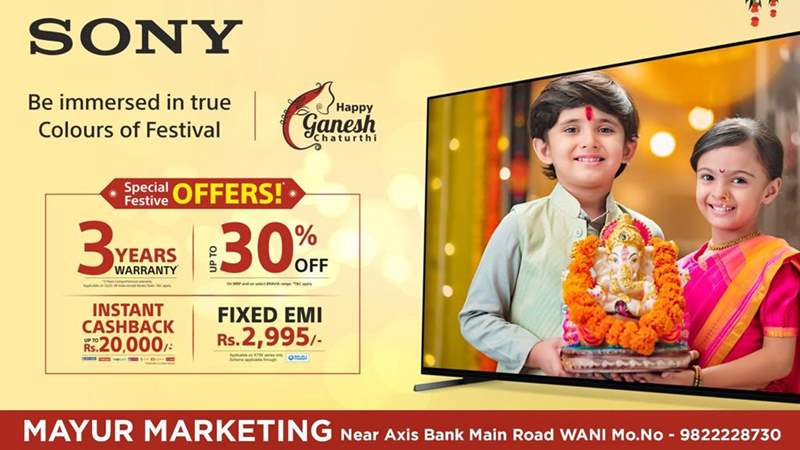 सुप्रसिद्ध सोनी कंपनीच्या टीव्हीवर मयूर मार्केटिंगमध्ये जम्बो ऑफर देण्यात येत आहे. यात खरेदीवर मूळ किमतीच्या 30 टक्के पर्यंतची सूट देण्यात येणार आहे, शिवाय डेबिट किंवा क्रेडिट कार्डने खरेदी केल्यास त्यावर 20 हजार पर्यंतची कॅशबॅक ऑफरचा लाभ ही ग्राहकांना मिळणार आहे. सोनी कंपनीच्या टीव्हीवर एरव्ही 1 वर्षाची वॉरंटी असते. मात्र गणेशोत्सव दरम्यान खरेदी केल्यास त्यावर 3 वर्षांची वॉरंटी मिळणार आहे. जर ईएमआयवर खरेदीचा विचार असेल तर 2995 रुपये फिक्स ईएमआयमध्येही टीव्ही खरेदी करता येणार आहे. विशेष म्हणजे मयूर मार्केटिंग हे सोनी कंपनीचे शहरातील अधिकृत डिलर आहेत.