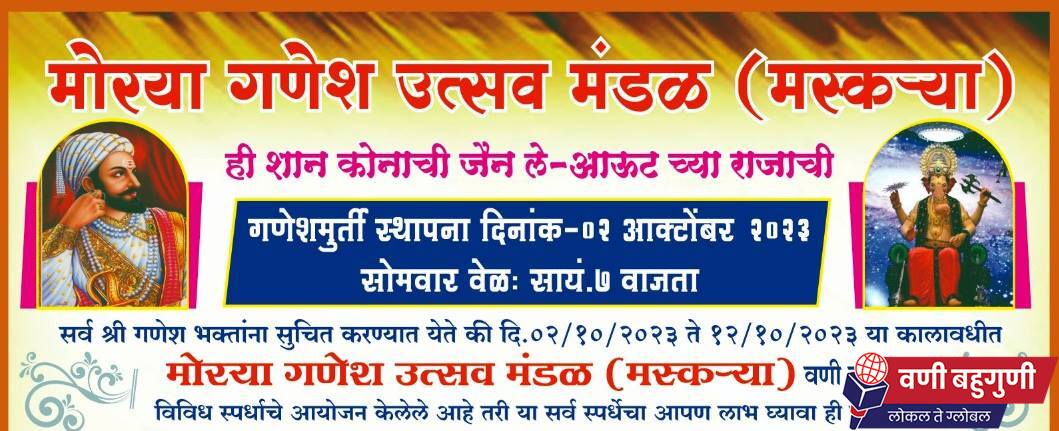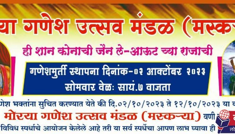 पुरुषोत्तम नवघरे, वणी: जैन ले आउट येथील मोरया गणेश उत्सव मंडळ (मस्क-या) तर्फे विविध उपक्रम, स्पर्धा व कार्यक्रमांचे आयोजन करण्यात आले आहे. सोमवार दिनांक 2 ऑक्टोबर पासून हे कार्यक्रम सुरू होणार असून संपूर्ण 10 दिवस विविध कार्यक्रमांची मेजवानी राहणार आहे. यात विविध स्पर्धा, आरोग्य शिबिर, जगरात, किर्तन इत्यादींचा समावेश आहे. विशेष म्हणजे घेतल्या जाणा-या सर्व स्पर्धेचे बक्षिस लगेच जाहीर केले जाणार आहे. या सर्व उपक्रम व कार्यक्रमात मोठ्या संख्येने सहभागी व्हावे असे आवाहन कऱण्यात आले आहे.