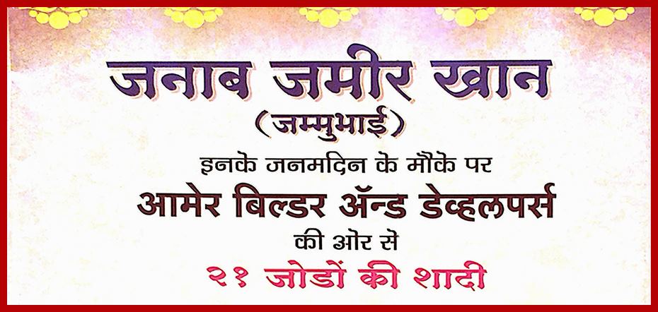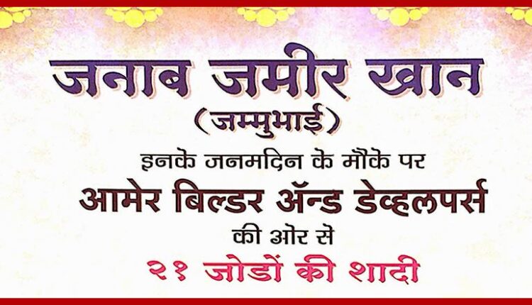 निकेश जिलठे, वणी: आज शुक्रवारी दिनांक 30 डिसेंबरला 21 मुस्लिम जोडप्यांचा सामूहिक विवाह (निकाह) सोहळा आयोजित करण्यात आला आहे. आशियाना हॉल येथे संध्याकाळी 6 वाजता हा सोहळा होणार आहे. आमेर बिल्डर अँड डेव्हलर्सच्या वतीने जमीर खान यांच्या वाढदिवसानिमित्त हा सामाजिक उपक्रम राबवण्यात येत आहे. दरवर्षी जम्मू खान यांच्या वाढदिवस विविध सामाजिक उपक्रम राबवून साजरा केला जातो. या वर्षी सामुहिक विवाह हा सामाजिक उपक्रम राबवण्यात येत आहे.