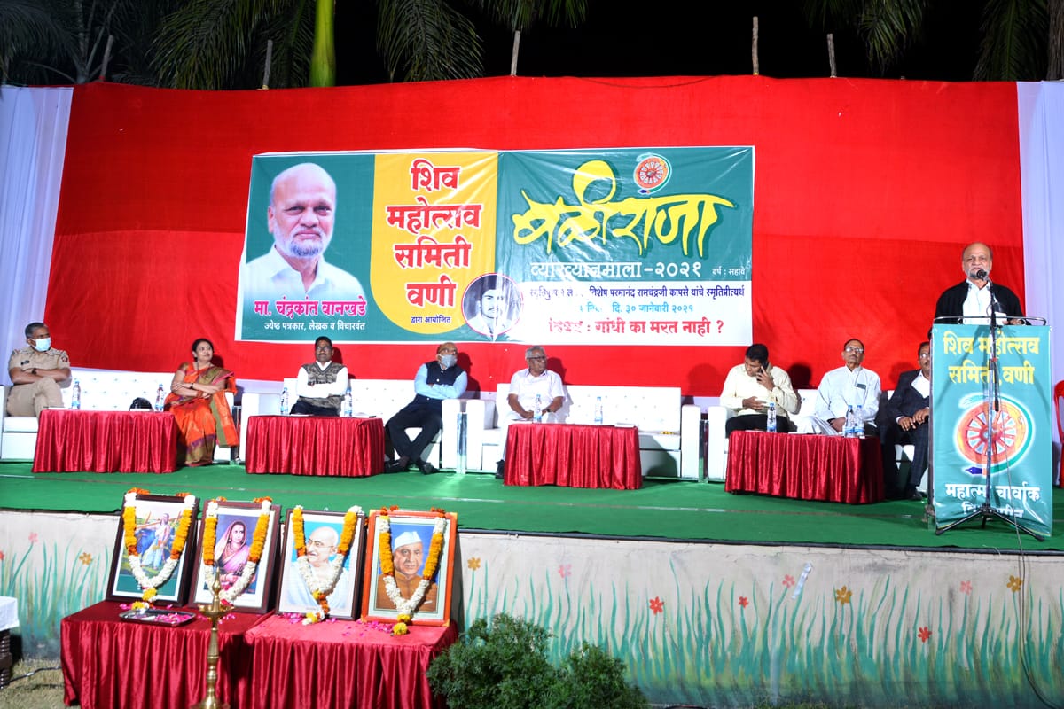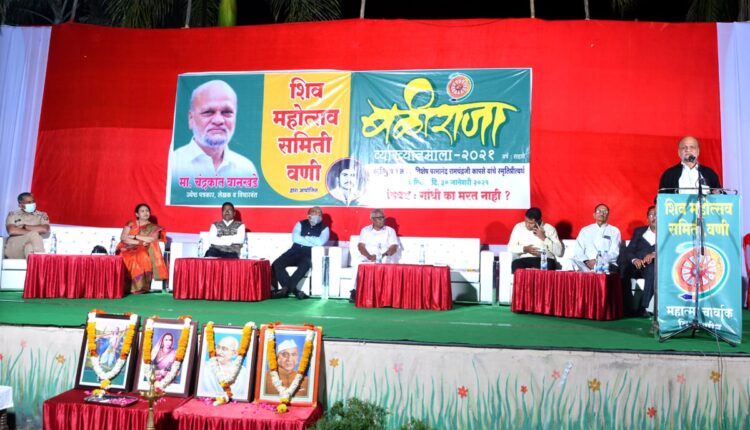 तालुका प्रतिनिधी, वणी: गांधी मरत नाही. मात्र कितीही व्हेंटिलेटरवर ठेवला तरी नथुराम जगत नाही. असे विचार चंद्रकांत वानखडे यांनी आपल्या भाषणातुन व्यक्त केले. शिव महोत्सव समिती वणी द्वारा आयोजित बळीराजा व्याख्यान मालेला दि. 30 शनिवारी संध्याकाळी 7 वाजता बाजोरिया लॉन येथे प्रारंभ झाला. पहिल स्मृतिपुष्प परमानंद रामचंद्र कापसे यांच्या स्मृतिप्रीत्यर्थ होतं. गांधी का मरत नाही ? या विषयावर ते प्रमुख व्याख्याते म्हणून बोलत होते. मंचावर कार्यक्रमाचे अध्यक्ष म्हणून माजी कुलगुरू भालचंद्र चोपणे, प्रमुख अतिथी म्हणून विधानसभेचे माजी उपसभापती मोरेश्वर टेंभुर्डे, उपविभागीय अधिकारी डॉ. शरद जावळे, ठाणेदार वैभव जाधव, अंबादास वागदरकर, प्रा. रेखा बडोदेकर, डॉ. भालचंद्र आवारी यांची उपस्थिती होती.