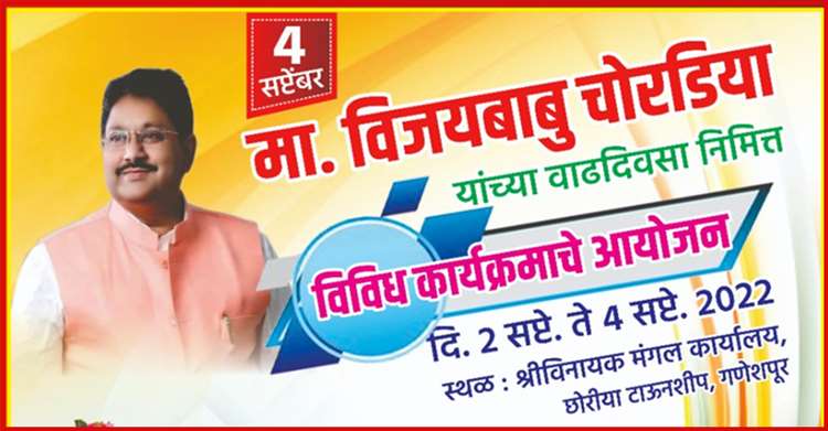 जितेंद्र कोठारी, वणी: शहरातील सुप्रसिद्ध व्यावसायिक व समाजसेवक विजय चोरडिया यांचा 4 सप्टेंबर रोजी वाढदिवस आहे. त्यानिमित्त शहरात विविध सामाजिक, सांस्कृतिक, शैक्षणिक कार्यक्रम व उपक्रम तसेच विविध स्पर्धेचे आयोजन करण्यात आले आहे. 2 सप्टेंबर पासून 4 सप्टेंबर असे तीन दिवस मुकुटबन रोडवरील श्रीविनायक मंगल कार्यालय येथे विविध कार्यक्रम घेतले जाणार आहे. या कार्यक्रमाला मोठ्या संख्येने उपस्थित राहावे असे आवाहन विजयबाबू चोरडिया मित्र परिवार तर्फे करण्यात आले आहे.